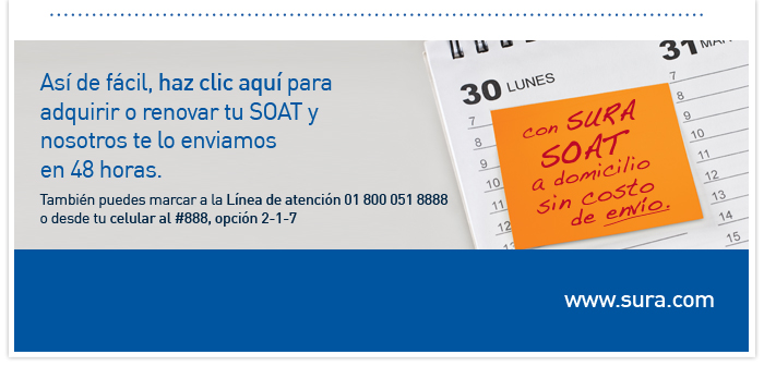 Te agradecemos tu intención de compra y te recordamos que si deseas adquirir el Seguro Autos, puedes ingresar a nuestra página en Internet www.sura.com o llamando a la Línea de atención al cliente 437 8888 para Bogotá, Cali y Medellín, 01 800 051 8888 resto del país o desde tu celular marca gratis #888. |