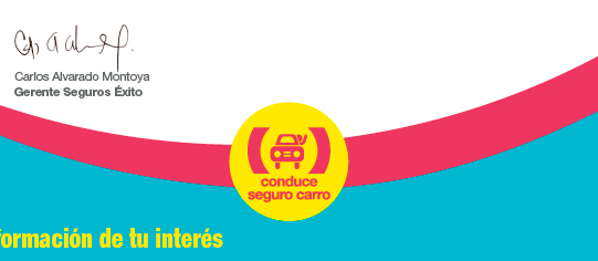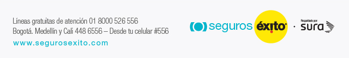 {Trato 1 (Apreciado –a)} {Nombre} Queremos darte la bienvenida a nuestra solución de protección Conduce Seguro Carro, a partir de este momento cuentas el acompañamiento de Seguros Éxito y el Respaldo de SURA, la aseguradora Líder en Colombia. Con Conduce Seguro Carro recibirás un acompañamiento en caso de daños a otras personas o a sus bienes. Además, recibirás asistencia jurídica en proceso penal o civil y asistencia en viajes, que incluye: * Grúa en caso de varada o accidente. Conoce más detalles de las coberturas, su aplicación y exclusiones, haciendo click aquí Tu protección inició el {Fecha de inicio} y finaliza el {Fecha fin vigencia}, y se renovará automáticamente año tras año para tu tranquilidad. {Trato 2 (Bienvenido –a)}. Gracias por confiar en nosotros. |